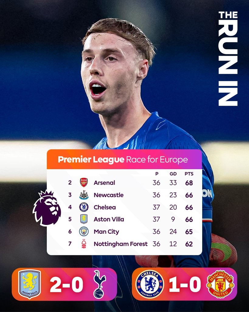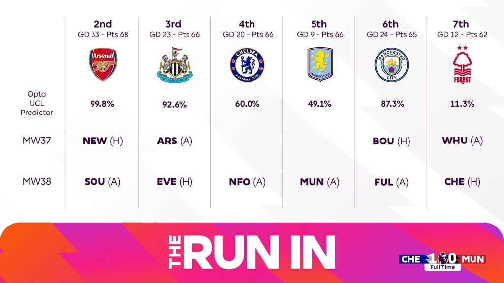 05月17日讯 英超第37轮打完两场,维拉2-0热刺,切尔西1-0曼联。英超官方晒出如今的争五格局图,并使用opta预测了争五成功率。